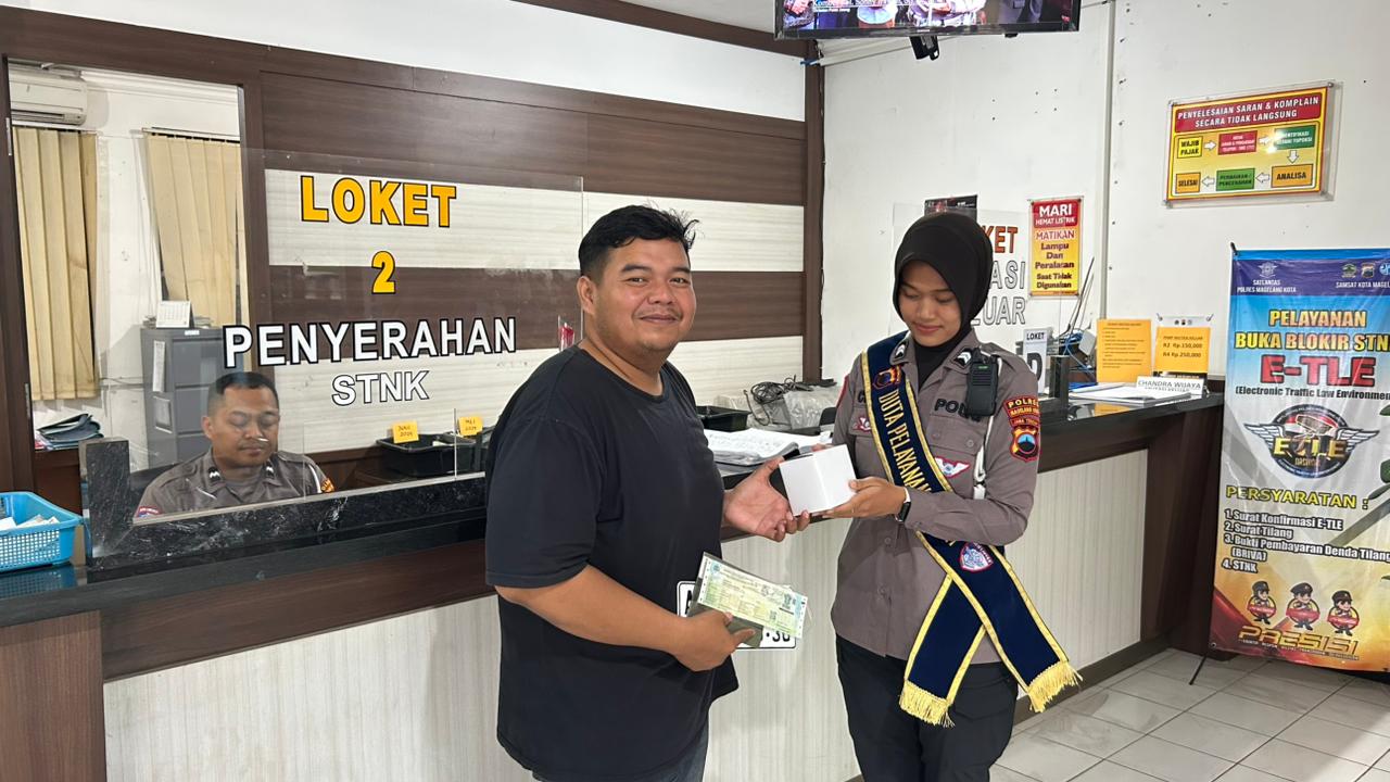 Kota Magelang – Satlantas Polres Magelang Kota melalui Unit Registrasi dan Identifikasi (Regident) memberikan pelayanan prima kepada masyarakat di Loket Penyerahan STNK Samsat Kota Magelang dengan menghadirkan inovasi penghargaan bagi wajib pajak yang taat membayar pajak kendaraan tepat waktu. Kegiatan ini menjadi salah satu upaya Polri dalam meningkatkan kualitas pelayanan publik yang cepat, ramah, dan transparan. Kamis (30/10/2025).