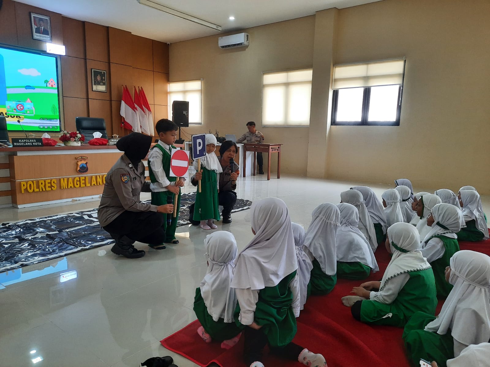 Dalam kegiatan tersebut, para siswa diajak mengenal lebih dekat sosok polisi sekaligus mendapatkan edukasi tentang tertib berlalu lintas sejak dini, termasuk pengenalan berbagai rambu-rambu lalu lintas dengan cara yang menyenangkan dan interaktif.